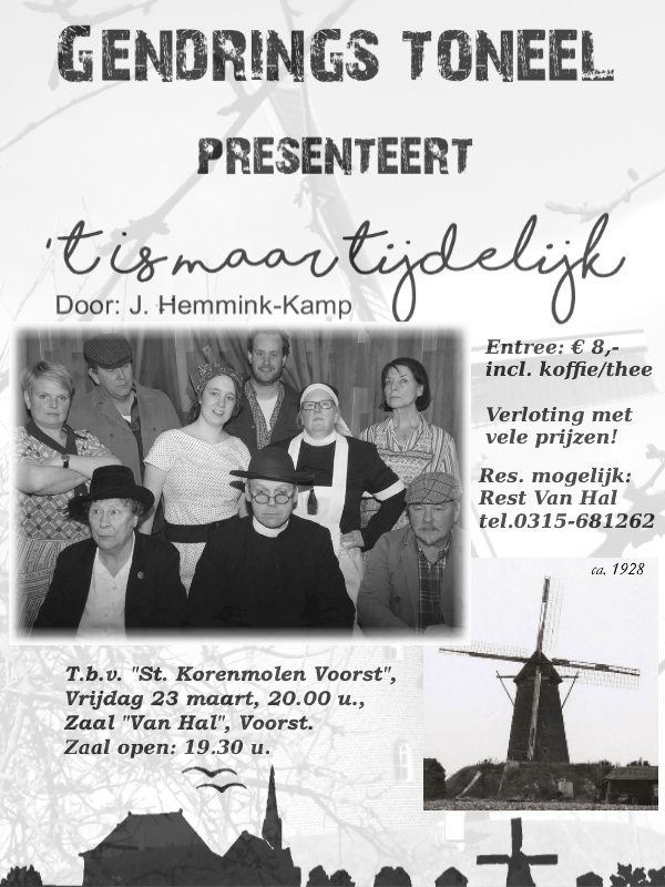 De toneeluitvoering is weer verleden tijd. Het was een groot succes! We hadden ruim 120 bezoekers in de zaal en dankzij de leden van het Gendrings Toneelgezelschap werd het mooie avond. Een mooie toevoeging aan de spaarpot voor het onderhoud van de molen van Van Hal in Voorst.
